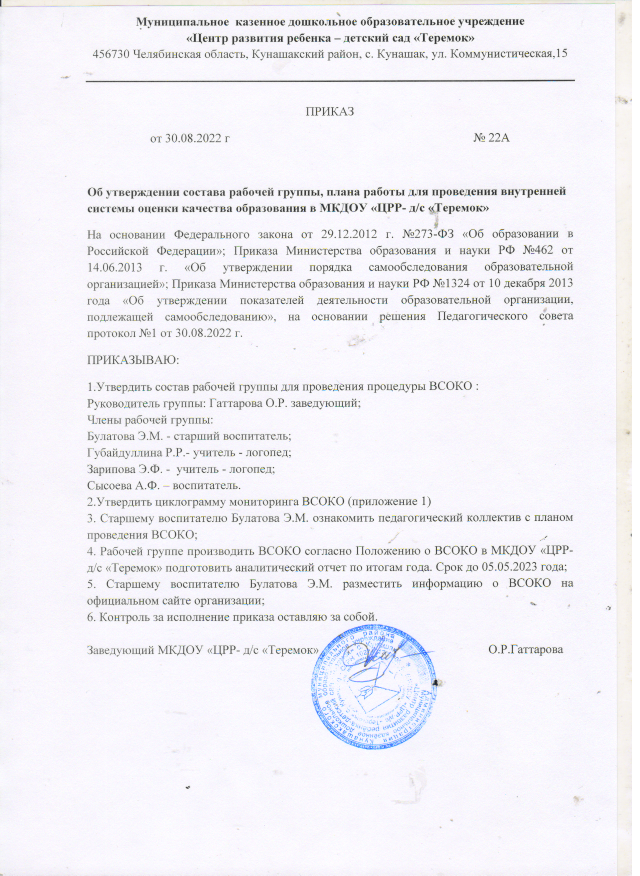Приказ о создании рабочей группы по разработке внутренней системы оценки качества образования в МКДОУ "ЦРР-д/с "Теремок"