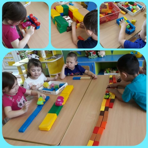 Воспитанники 1 мл.гр. под руководством воспитателя Нуриахметовой А.П. сооружали небольшие постройки из кубиков. Конструирование «Гараж для машины», «Широкая и узкая дороги» проводилось с целью научить детей строить гараж для машинки из строительного материала.